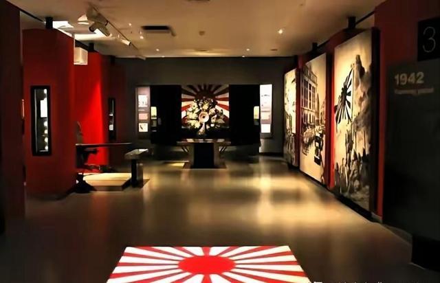 二战展厅的入口地面,长年投影着一面日本军旗的图案。参观者走进展厅,必须踩过这面旗的投影才能继续前行。